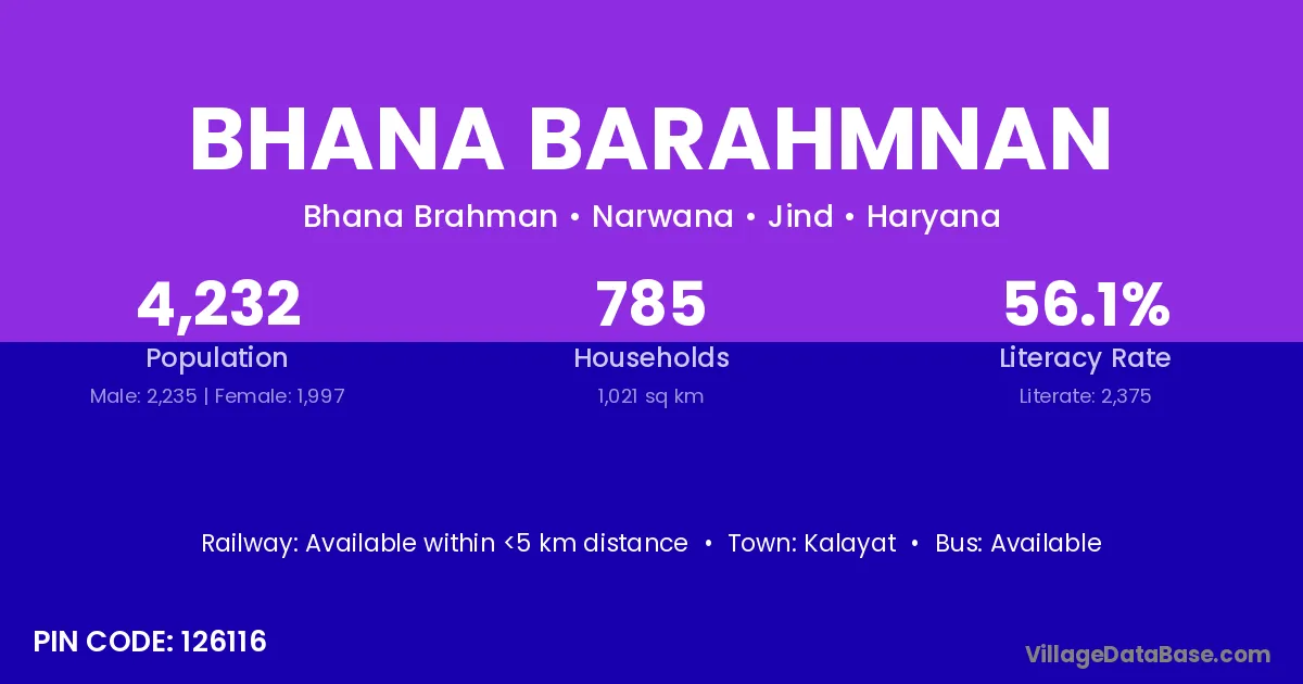 Bhana Barahmnan village has a total population of 4,232 people, of which 2,235 are males and 1,997 are females.