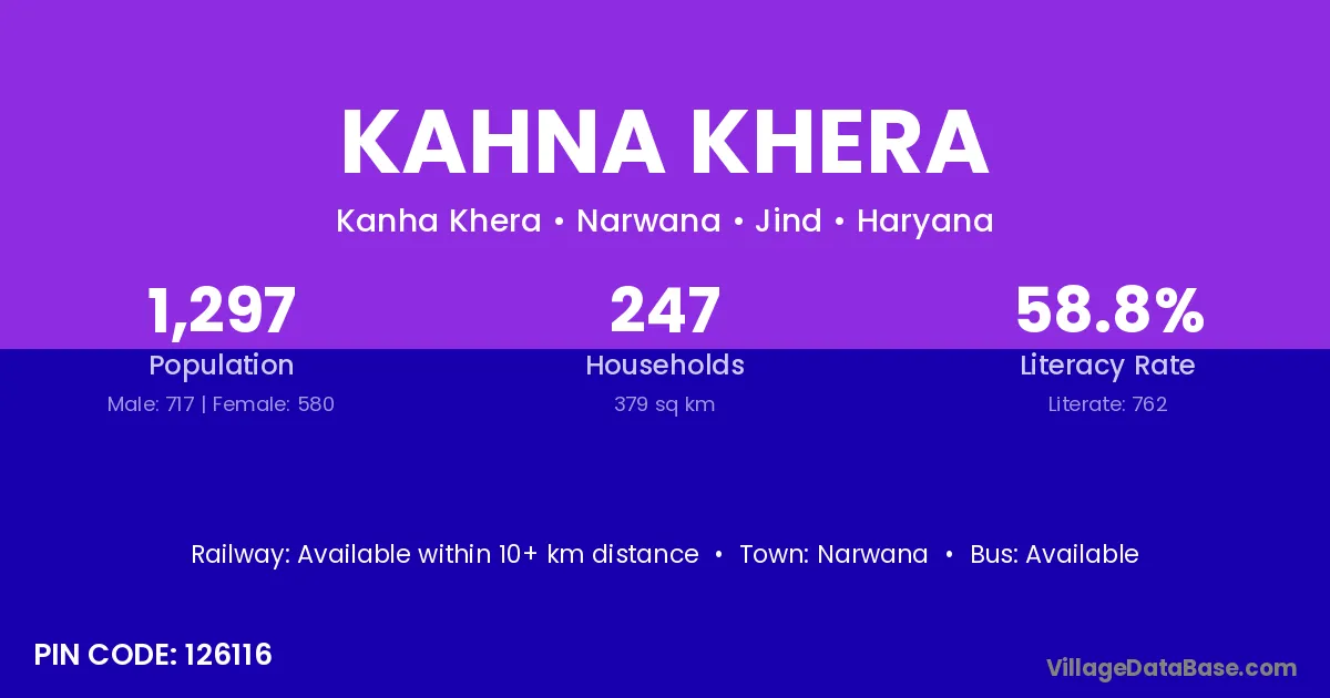 Kahna Khera village has a total population of 1,297 people, of which 717 are males and 580 are females.