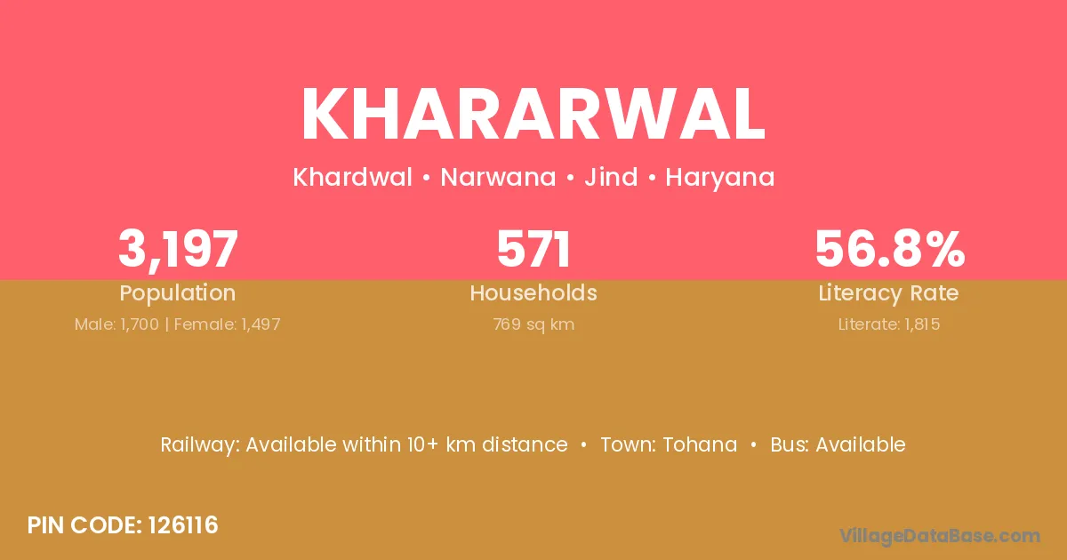 Khararwal village has a total population of 3,197 people, of which 1,700 are males and 1,497 are females.
