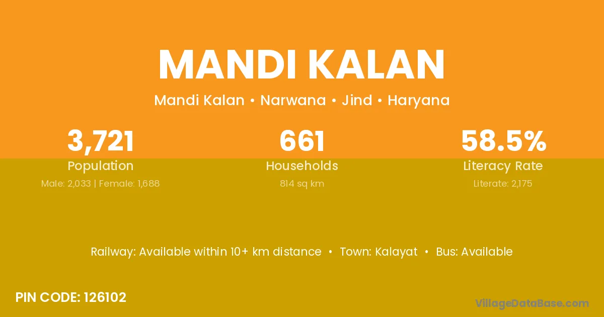 Mandi Kalan village has a total population of 3,721 people, of which 2,033 are males and 1,688 are females.