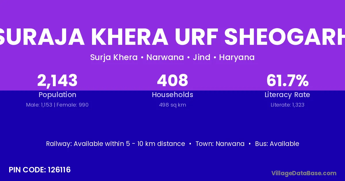 Suraja Khera Urf Sheogarh village has a total population of 2,143 people, of which 1,153 are males and 990 are females.