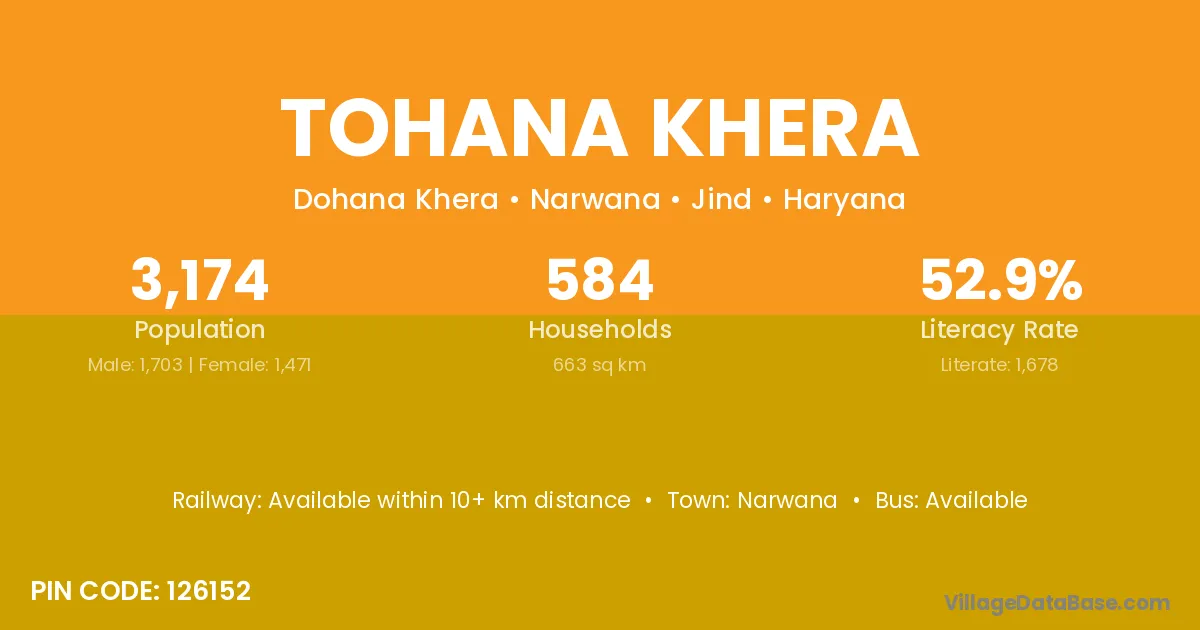 Tohana Khera village has a total population of 3,174 people, of which 1,703 are males and 1,471 are females.