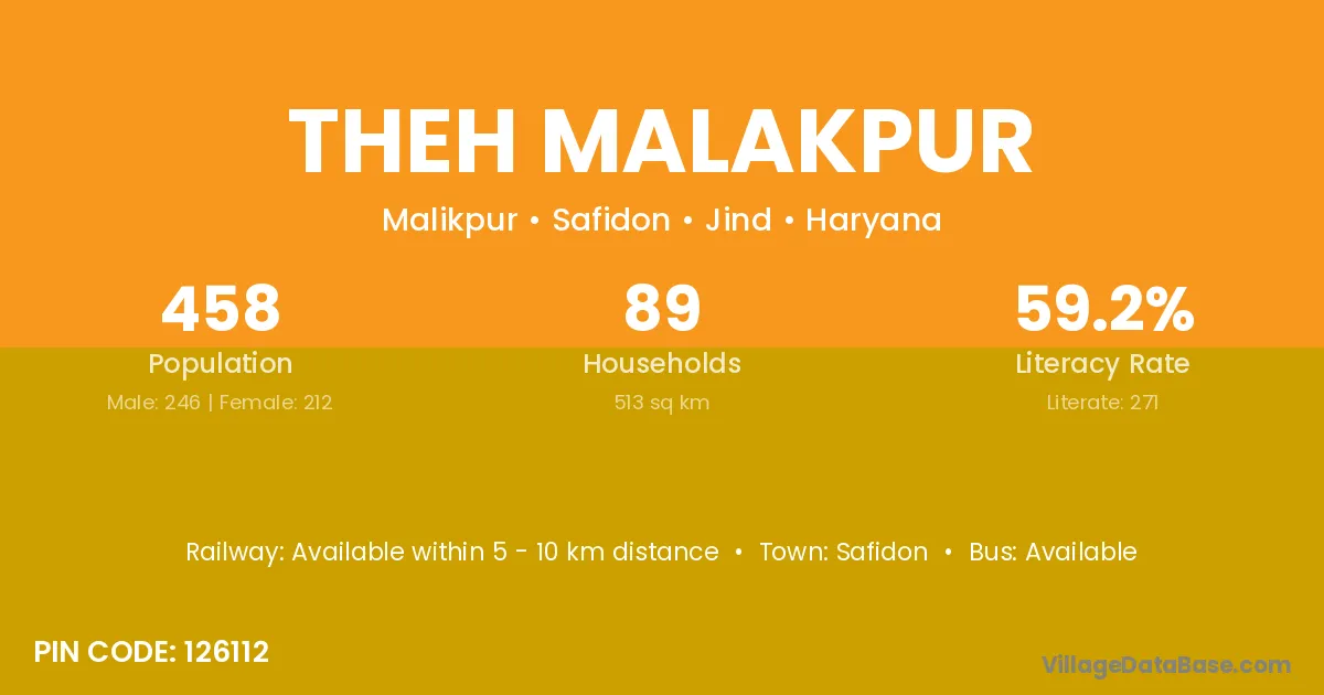 Theh Malakpur village has a total population of 458 people, of which 246 are males and 212 are females.