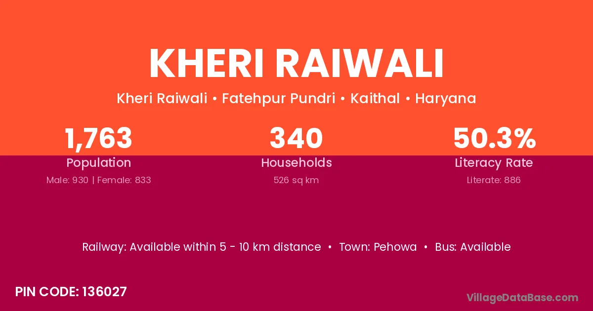 Kheri Raiwali village has a total population of 1,763 people, of which 930 are males and 833 are females.