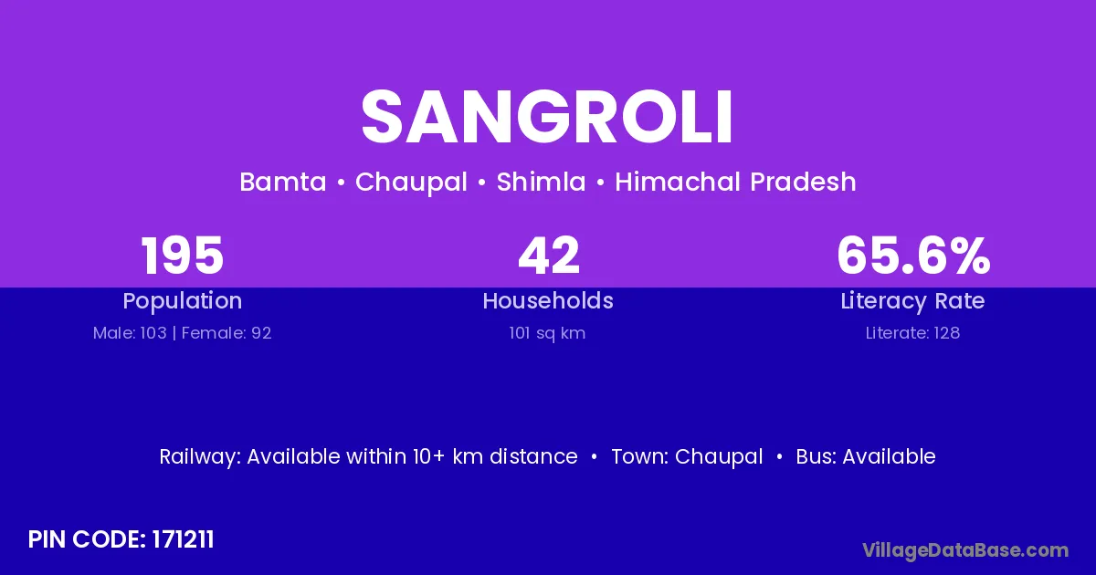 The literacy rate of Sangroli village is 64.48%. Male literacy stands at 71.46% and female literacy at 56.64%.