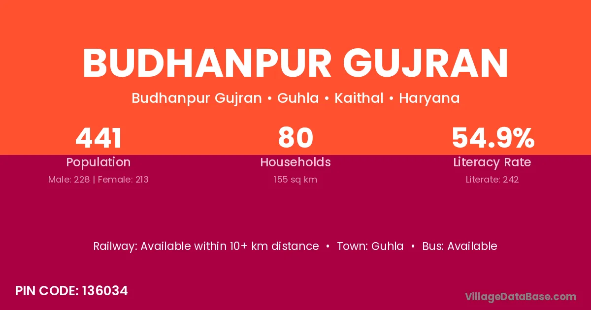 Budhanpur Gujran village has a total population of 441 people, of which 228 are males and 213 are females.