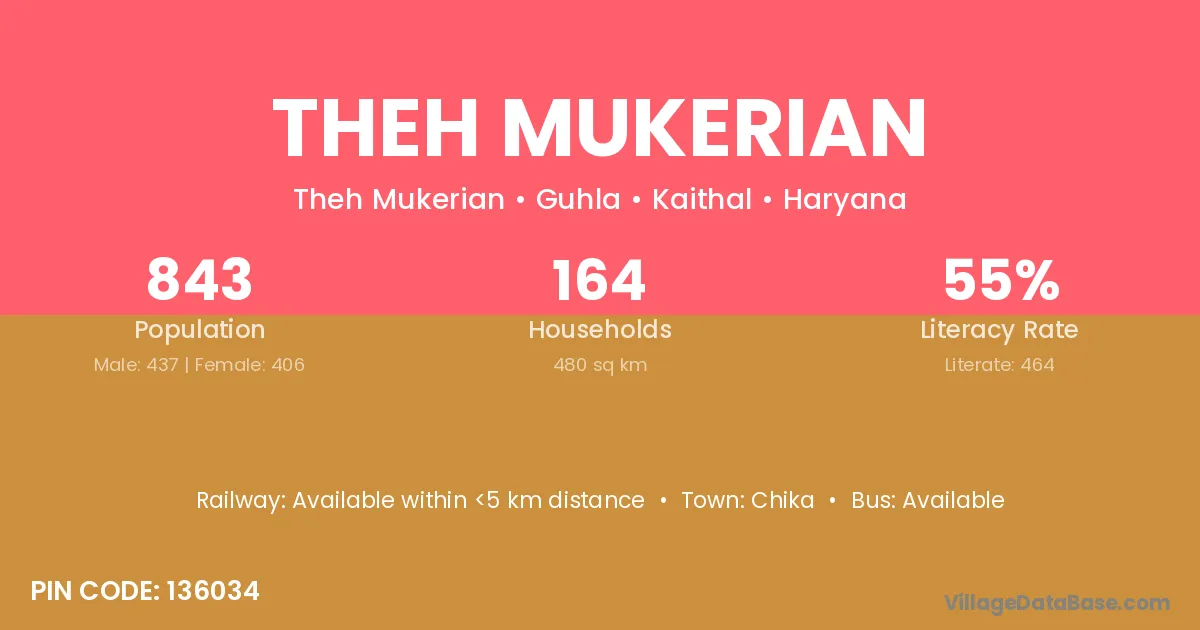 Theh Mukerian village has a total population of 843 people, of which 437 are males and 406 are females.