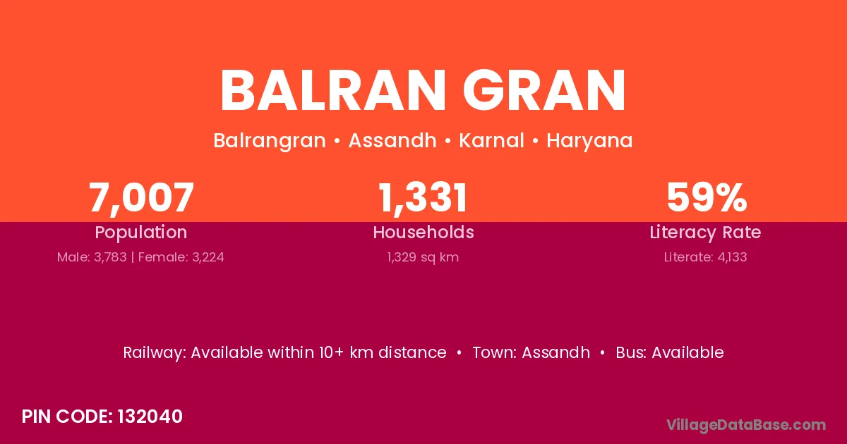 Balran Gran village has a total population of 7,007 people, of which 3,783 are males and 3,224 are females.