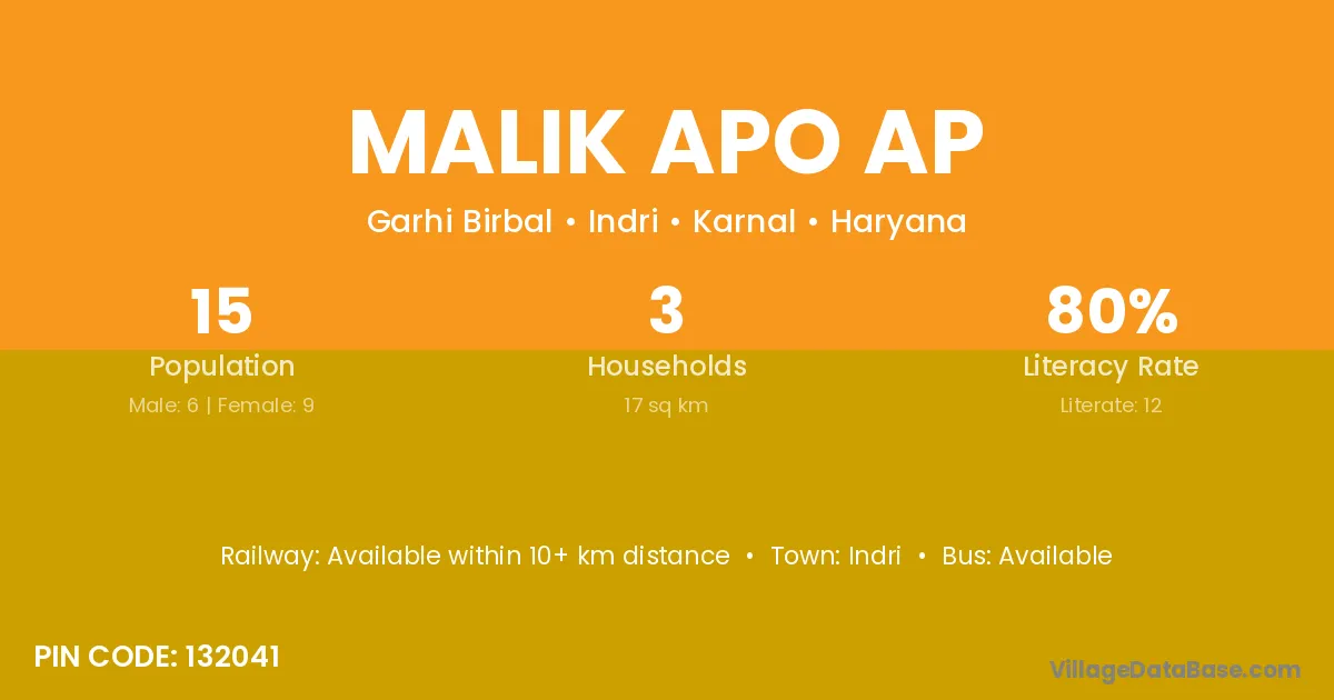 Malik Apo Ap village has a total population of 15 people, of which 6 are males and 9 are females.