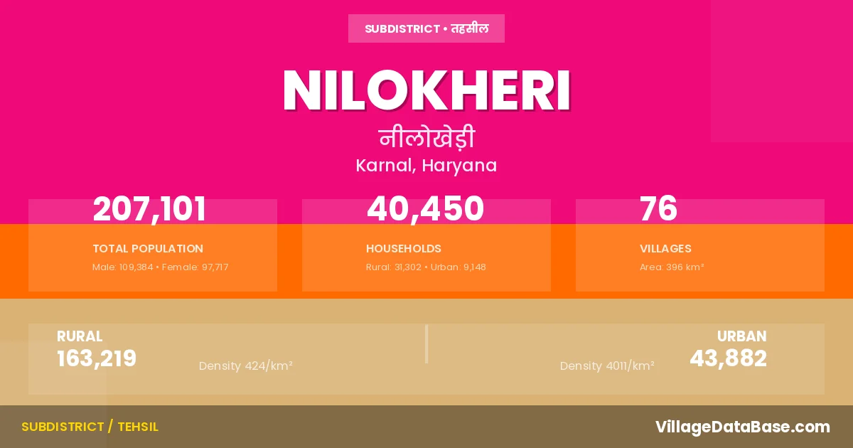 According to the 2011 census The total area of Nilokheri Tehsil is 396 km², with a population of 207101 people. The population density is 523 inhabitants per square kilometre, and there are approximately 40450 houses in the sub district.