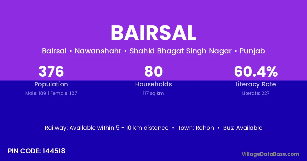 According to Census 2011 information, the village code of Bairsal village is 132117.