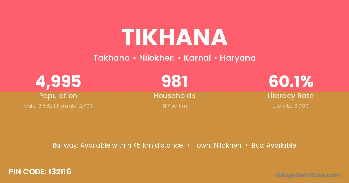 Tikhana village has a total population of 4,995 people, of which 2,592 are males and 2,403 are females.