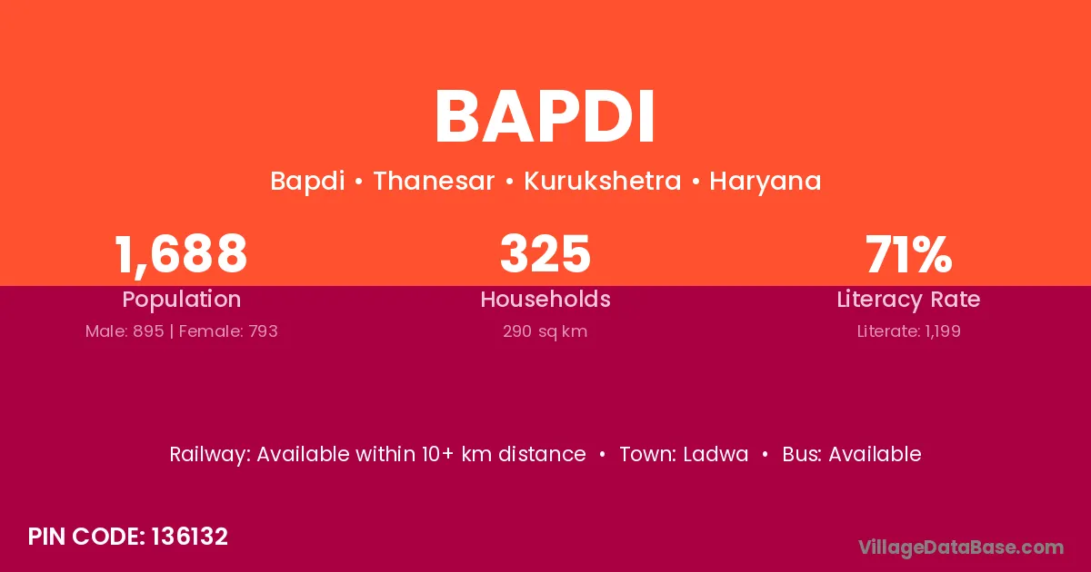Bapdi village has a total population of 1,688 people, of which 895 are males and 793 are females.