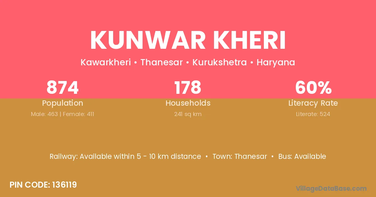Kunwar Kheri village has a total population of 874 people, of which 463 are males and 411 are females.
