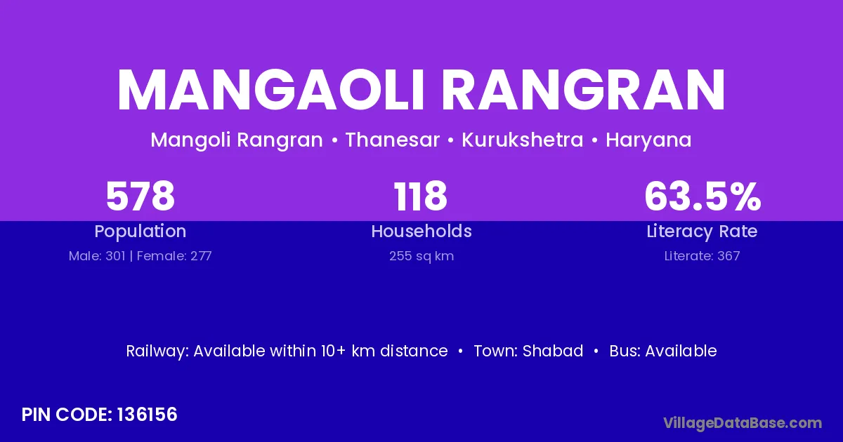 Mangaoli Rangran village has a total population of 578 people, of which 301 are males and 277 are females.