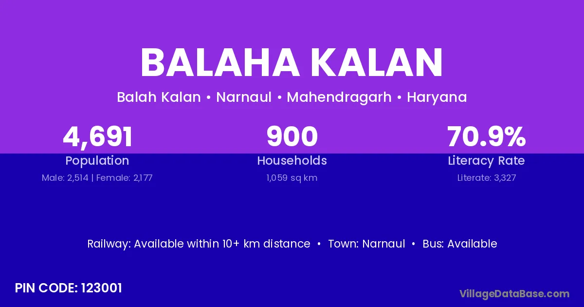 Balaha Kalan village has a total population of 4,691 people, of which 2,514 are males and 2,177 are females.