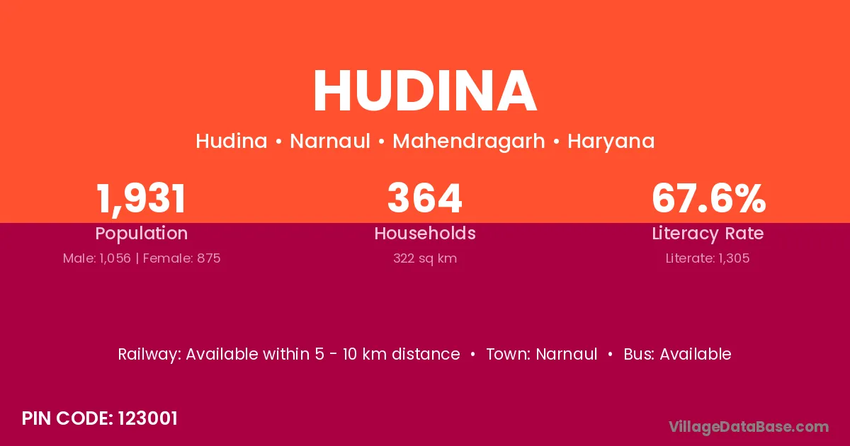 Hudina village has a total population of 1,931 people, of which 1,056 are males and 875 are females.