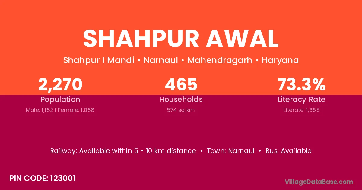 Shahpur Awal village has a total population of 2,270 people, of which 1,182 are males and 1,088 are females.