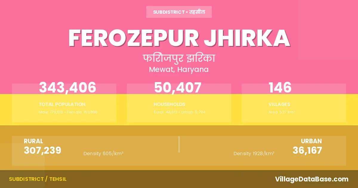 According to the 2011 census The total area of Ferozepur Jhirka Tehsil is 527 km², with a population of 343406 people. The population density is 652 inhabitants per square kilometre, and there are approximately 50407 houses in the sub district.