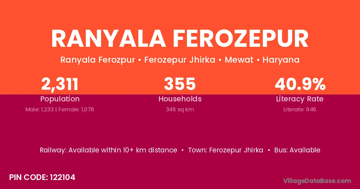 Ranyala Ferozepur village has a total population of 2,311 people, of which 1,233 are males and 1,078 are females.