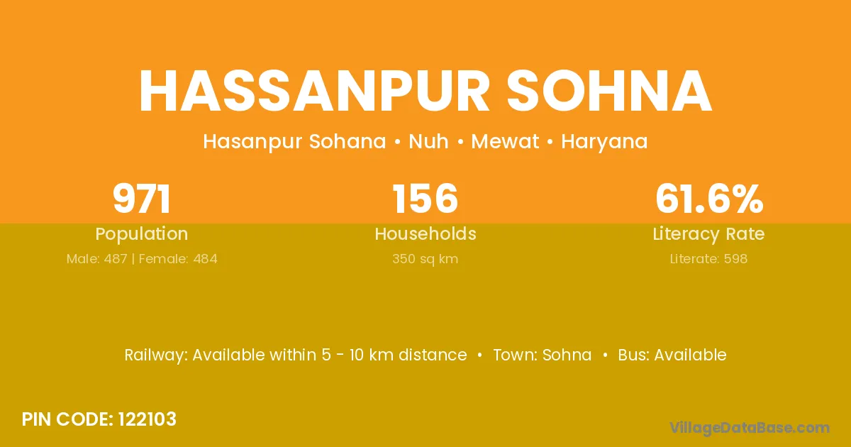 Hassanpur Sohna village has a total population of 971 people, of which 487 are males and 484 are females.