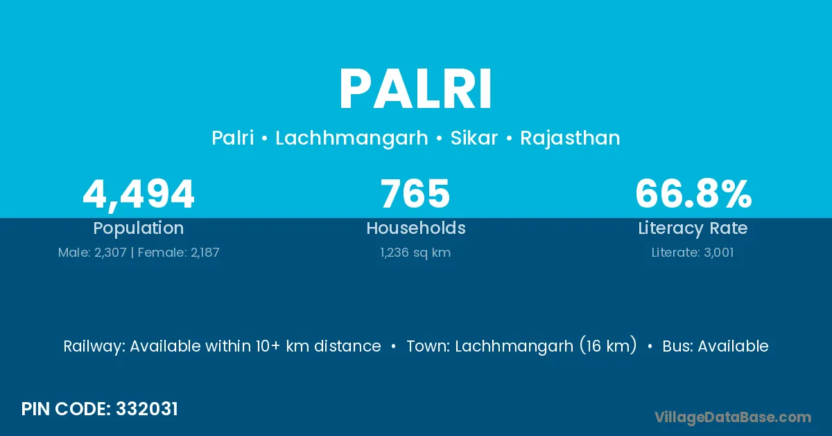 The literacy rate of Palri village is 37.38%. Male literacy stands at 49.10% and female literacy at 24.42%.