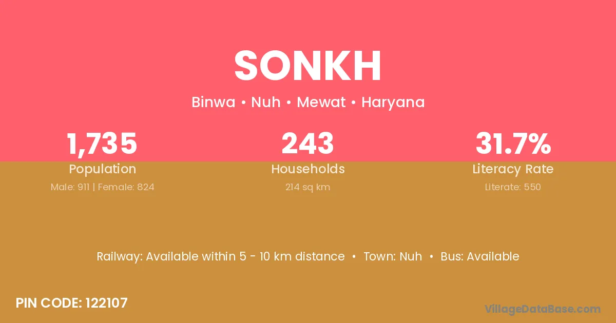 Sonkh village has a total population of 1,735 people, of which 911 are males and 824 are females.