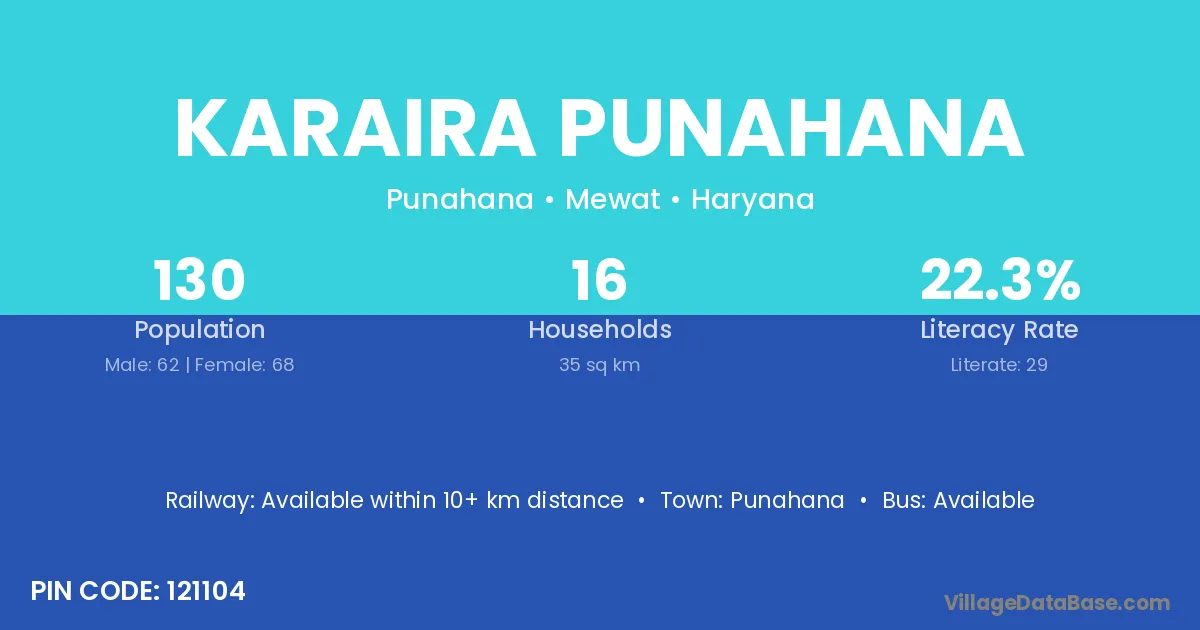 The literacy rate of Karaira Punahana village is 22.31%. Male literacy stands at 33.87% and female literacy at 11.76%.