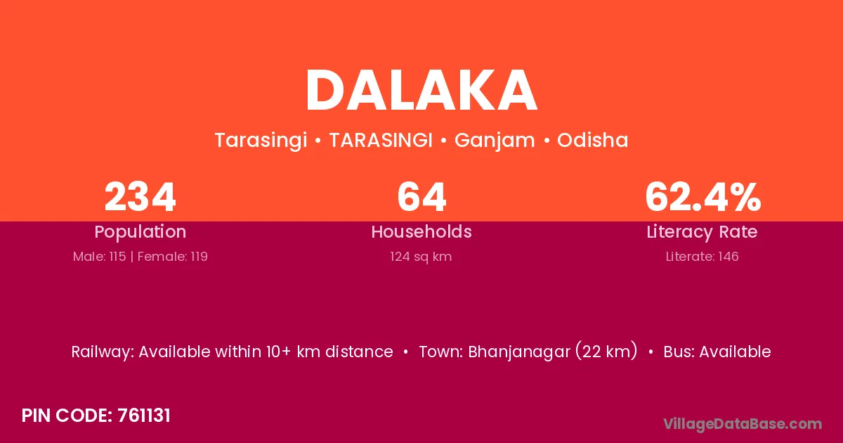Dalaka village has a total population of 146 people, of which 74 are males and 72 are females.