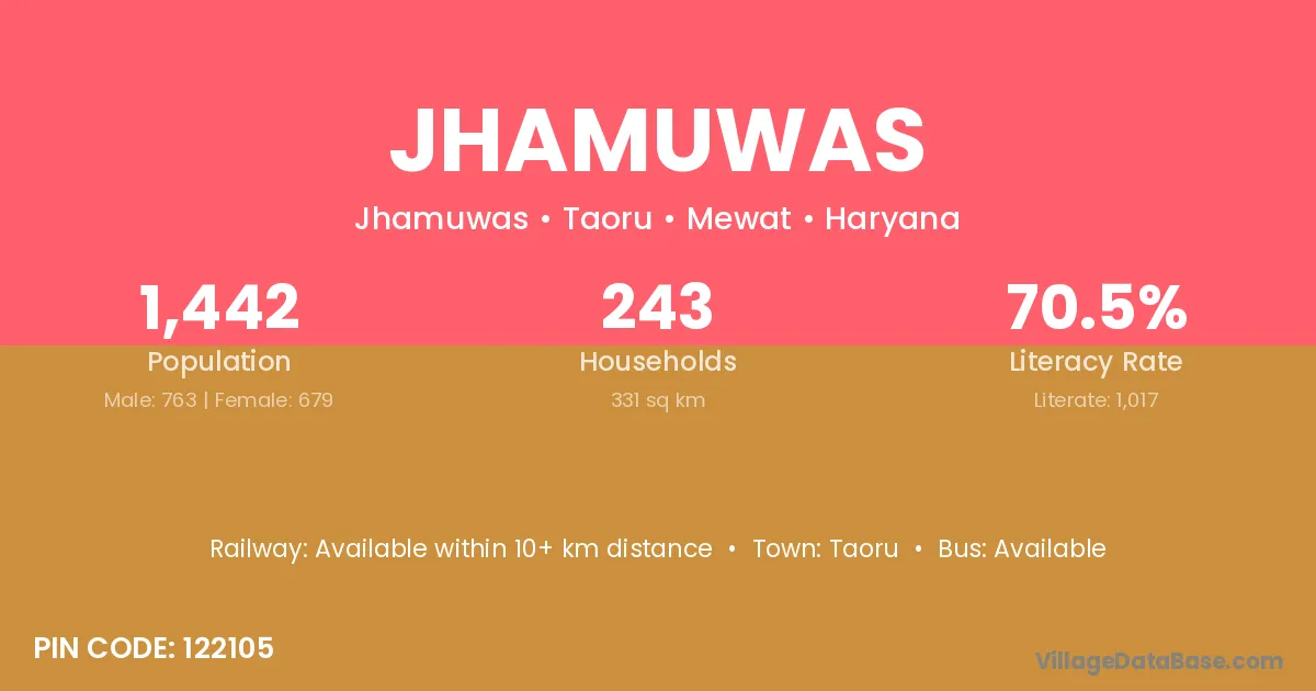 Jhamuwas village has a total population of 1,442 people, of which 763 are males and 679 are females.