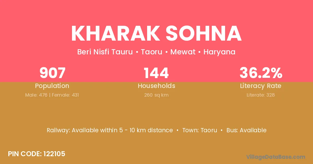 Kharak Sohna village has a total population of 907 people, of which 476 are males and 431 are females.