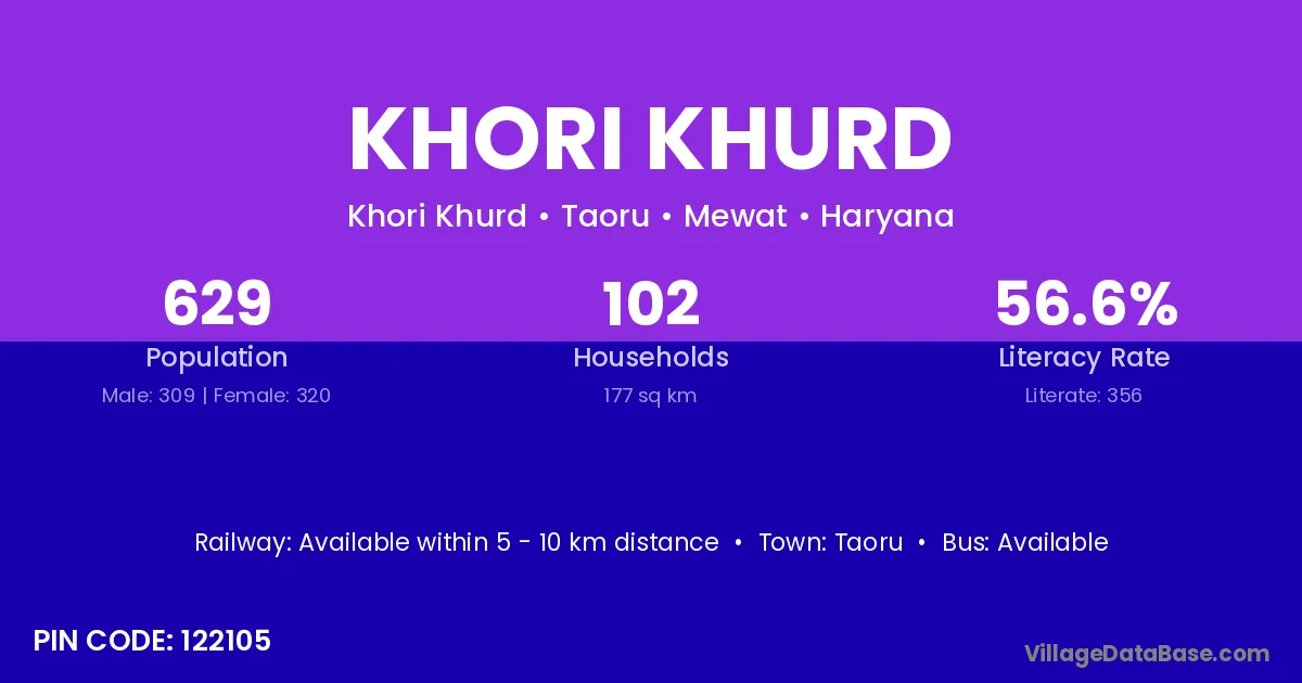 Khori Khurd village has a total population of 629 people, of which 309 are males and 320 are females.