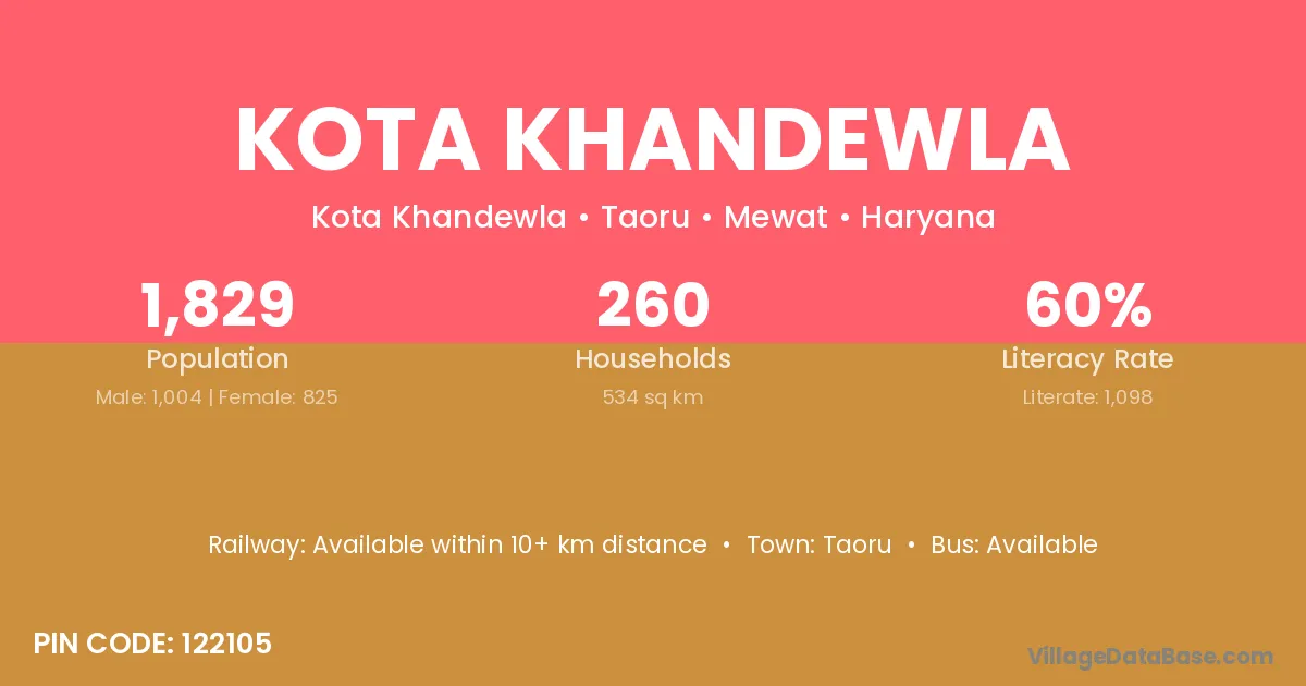 Kota Khandewla village has a total population of 1,829 people, of which 1,004 are males and 825 are females.