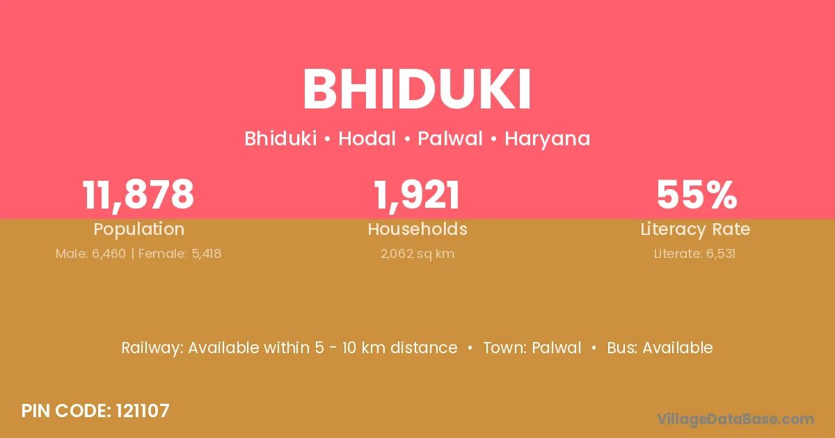 Palwal is the nearest town to Bhiduki village for major economic activities
