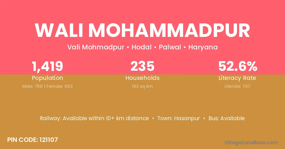 Wali Mohammadpur village has a total population of 1,419 people, of which 766 are males and 653 are females.