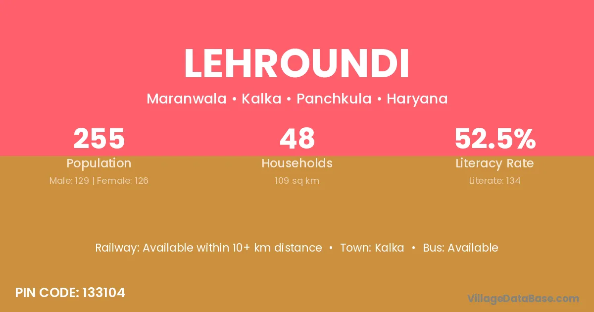 Lehroundi village has a total population of 255 people, of which 129 are males and 126 are females.