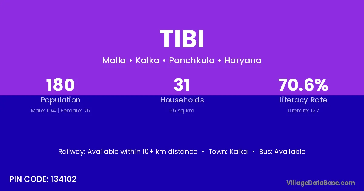 Tibi village has a total population of 180 people, of which 104 are males and 76 are females.