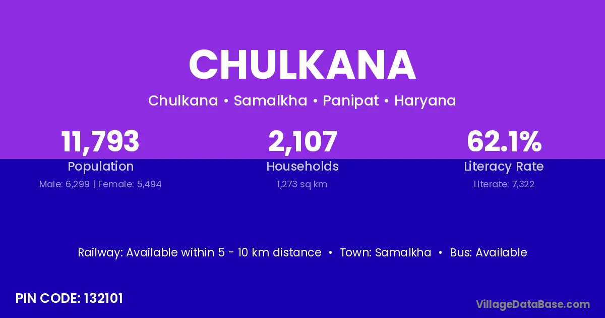 Chulkana village has a total population of 11,793 people, of which 6,299 are males and 5,494 are females.