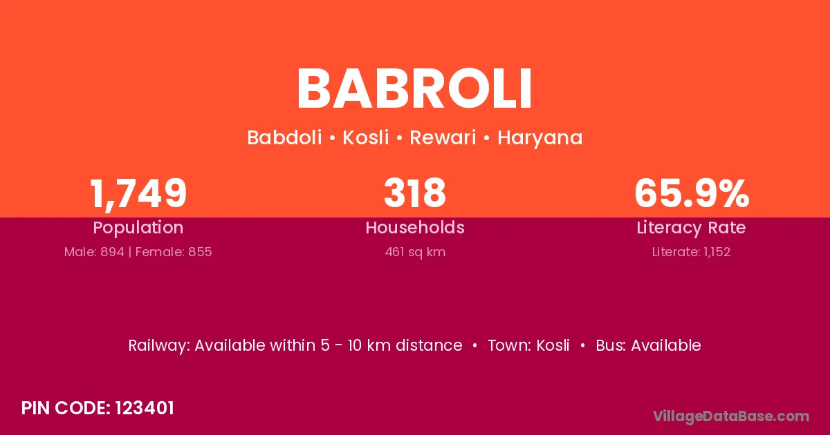 According to Census 2011 information, the village code of Babroli village is 123401.