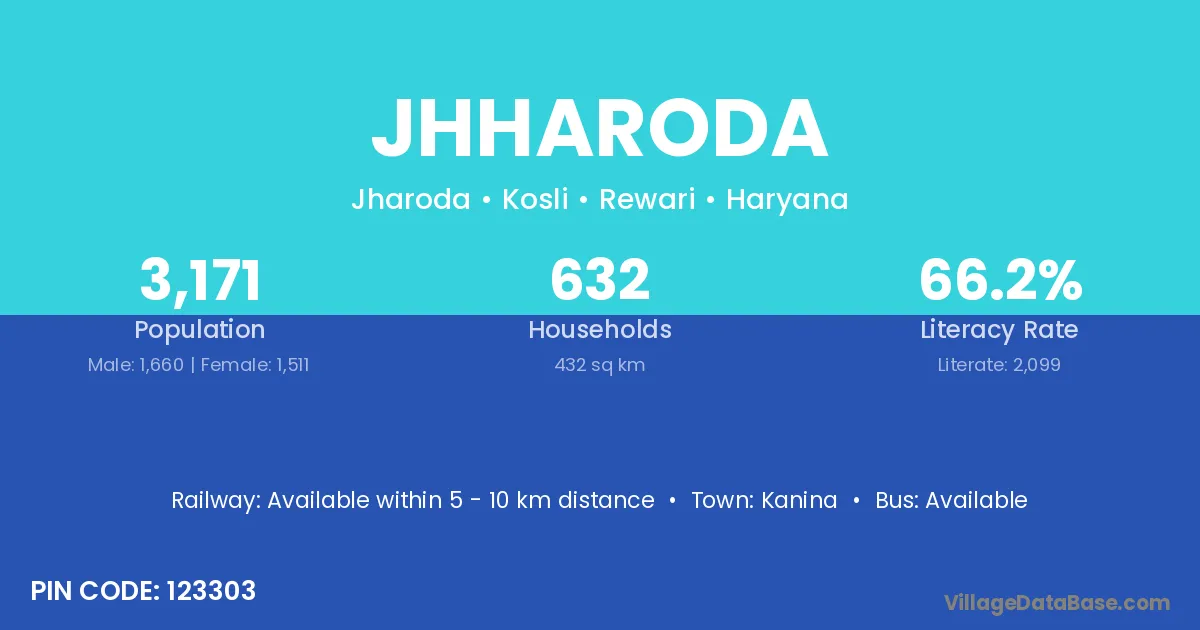 According to Census 2011 information, the village code of Jhharoda village is 123303.