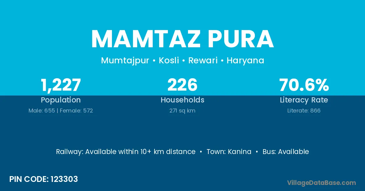 Mamtaz Pura village has a total population of 1,227 people, of which 655 are males and 572 are females.