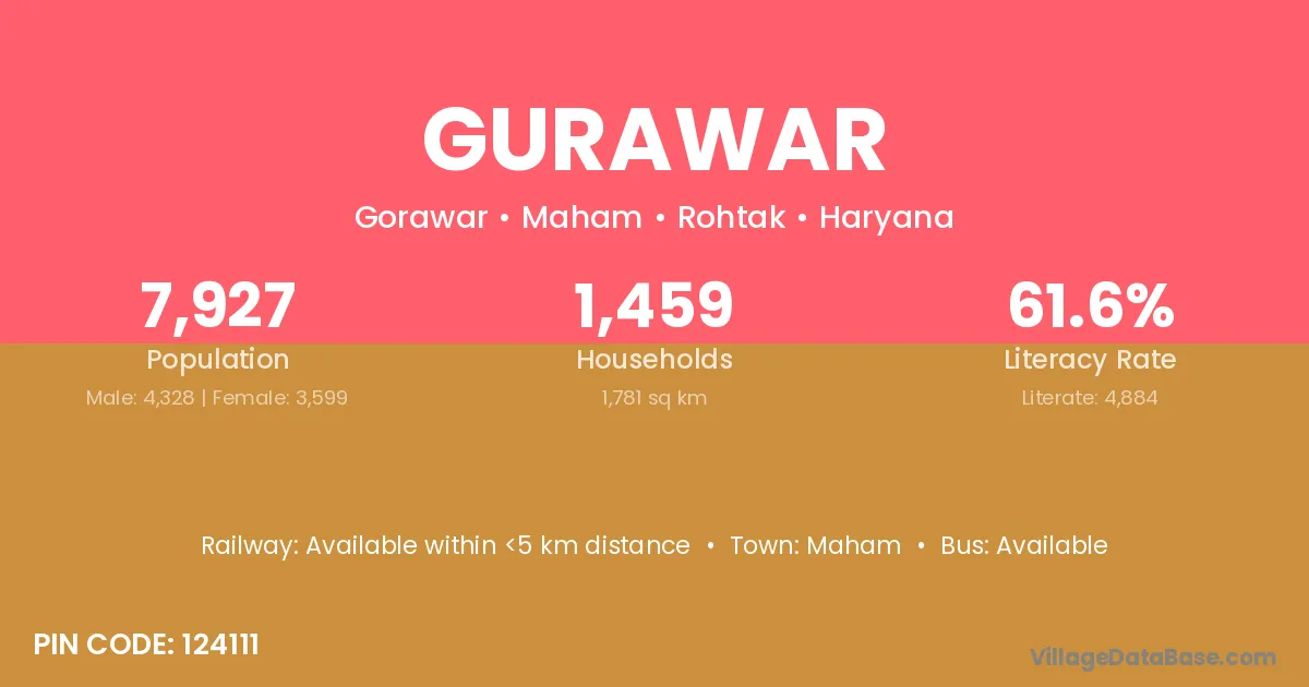 Gurawar village has a total population of 7,927 people, of which 4,328 are males and 3,599 are females.
