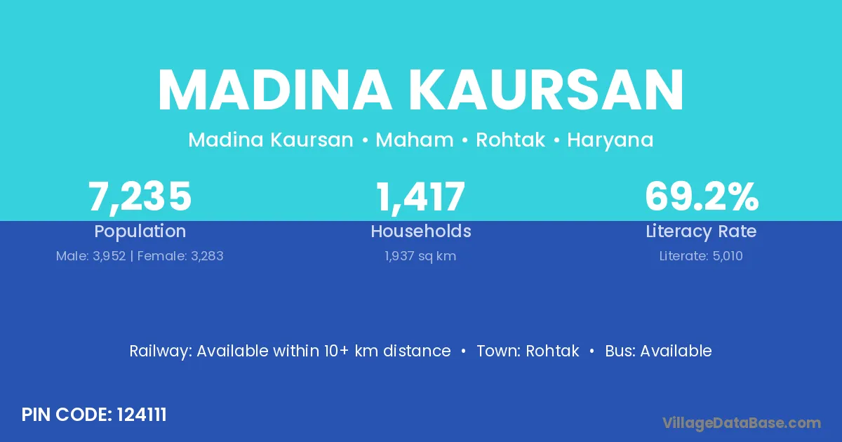 Rohtak is the nearest town to Madina Kaursan village for major economic activities