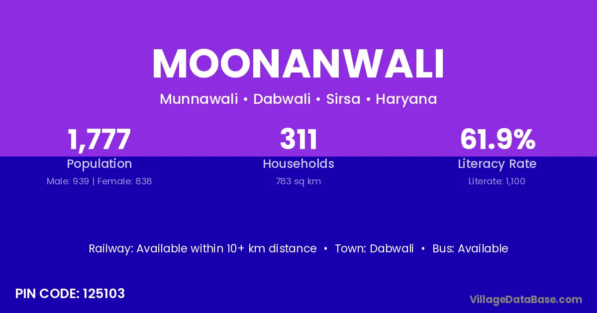 Moonanwali village has a total population of 1,777 people, of which 939 are males and 838 are females.