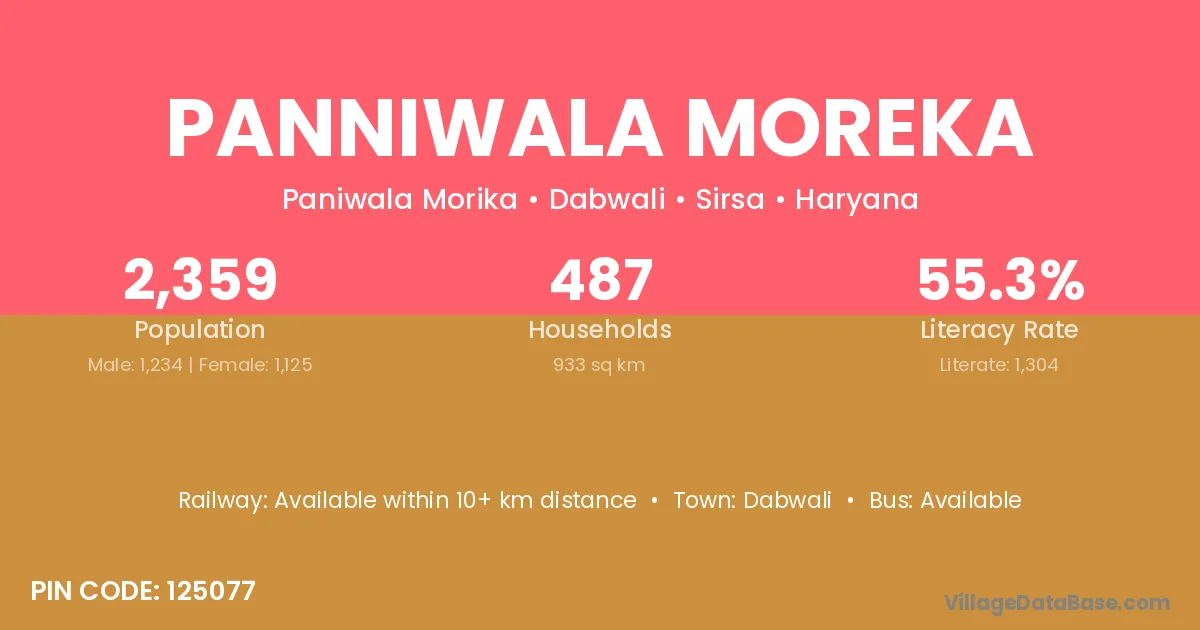Panniwala Moreka village has a total population of 2,359 people, of which 1,234 are males and 1,125 are females.