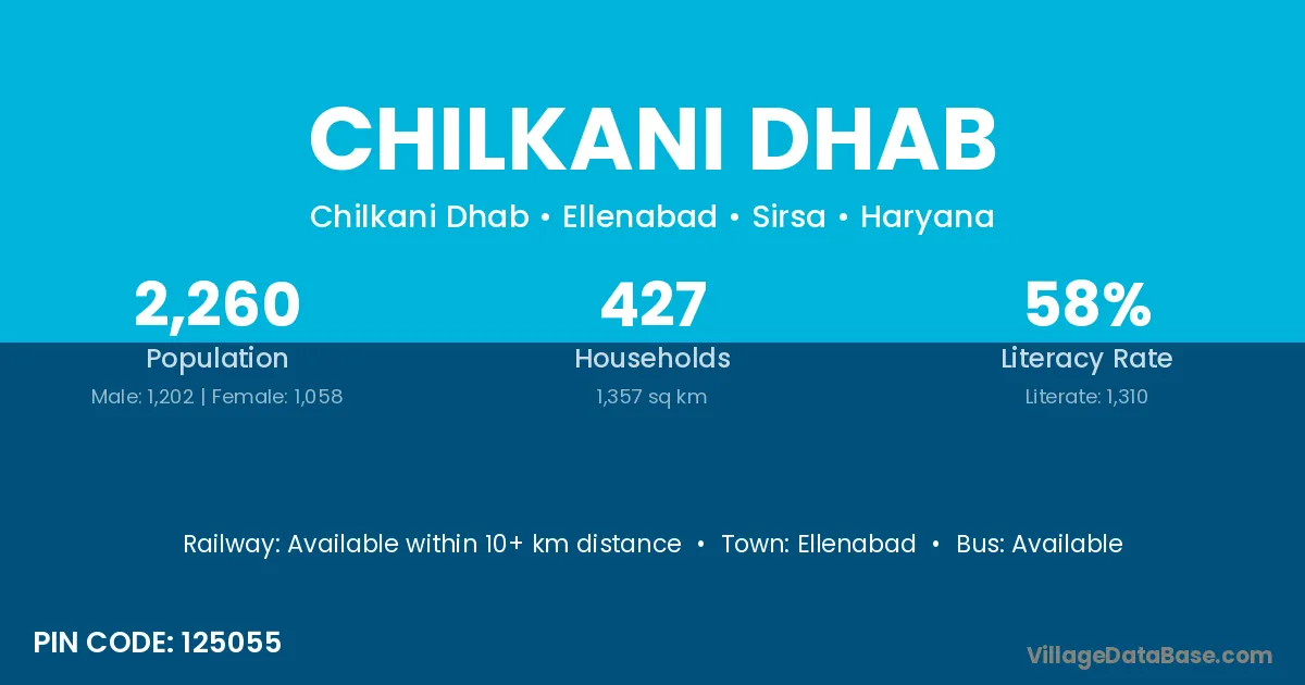 Chilkani Dhab village has a total population of 2,260 people, of which 1,202 are males and 1,058 are females.