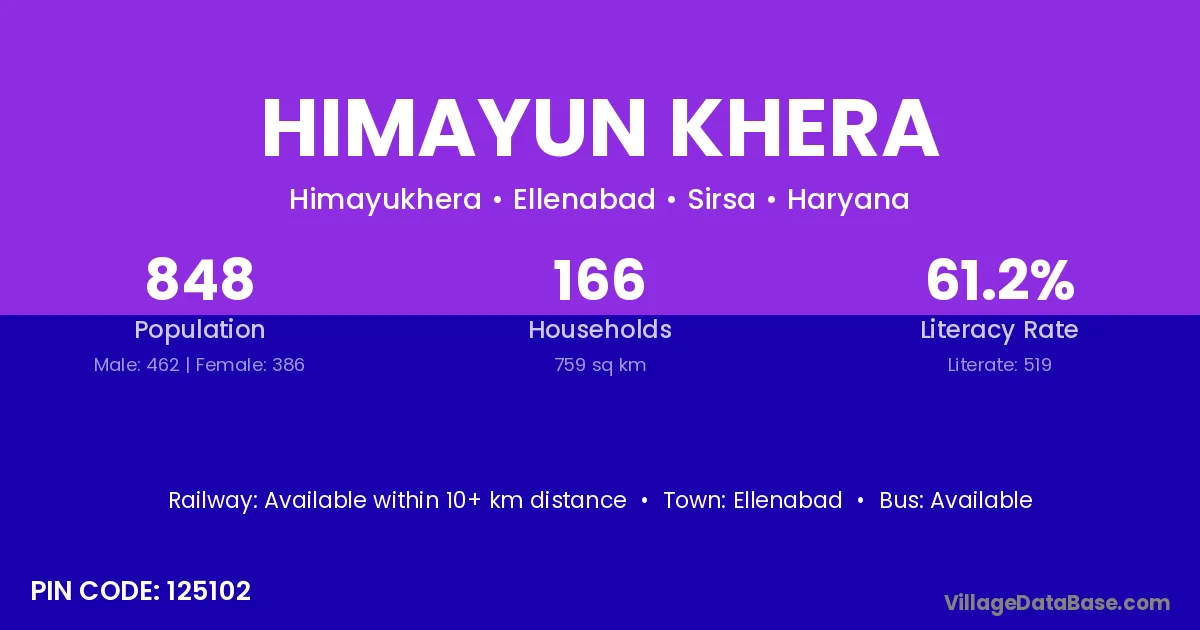Himayun Khera village has a total population of 848 people, of which 462 are males and 386 are females.