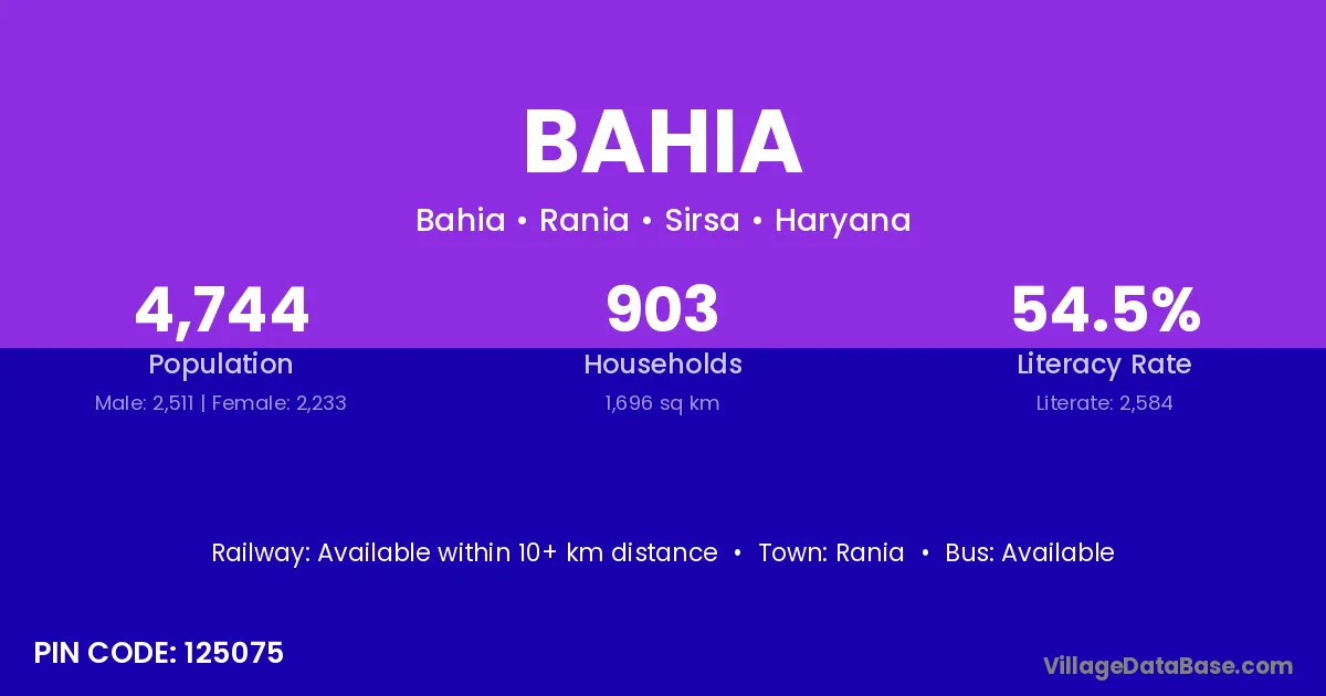 Bahia village has a total population of 4,744 people, of which 2,511 are males and 2,233 are females.