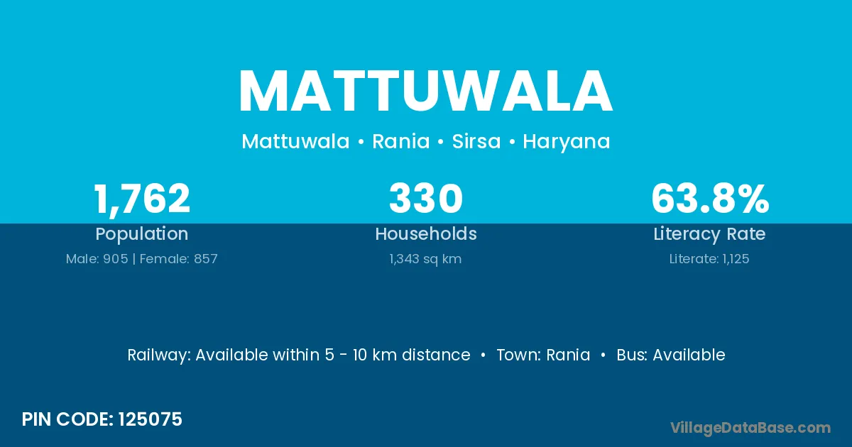 Mattuwala village has a total population of 1,762 people, of which 905 are males and 857 are females.