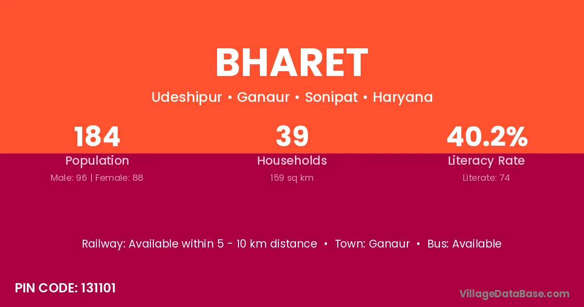 Bharet village has a total population of 184 people, of which 96 are males and 88 are females.